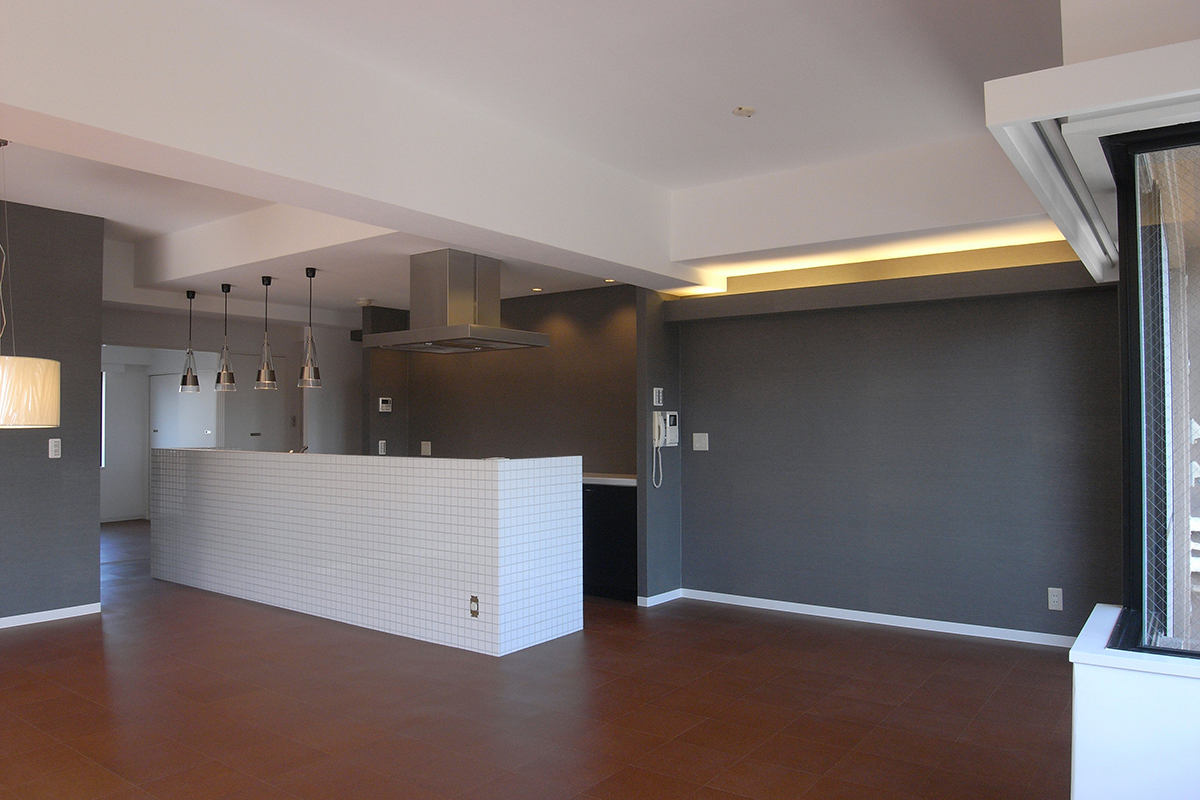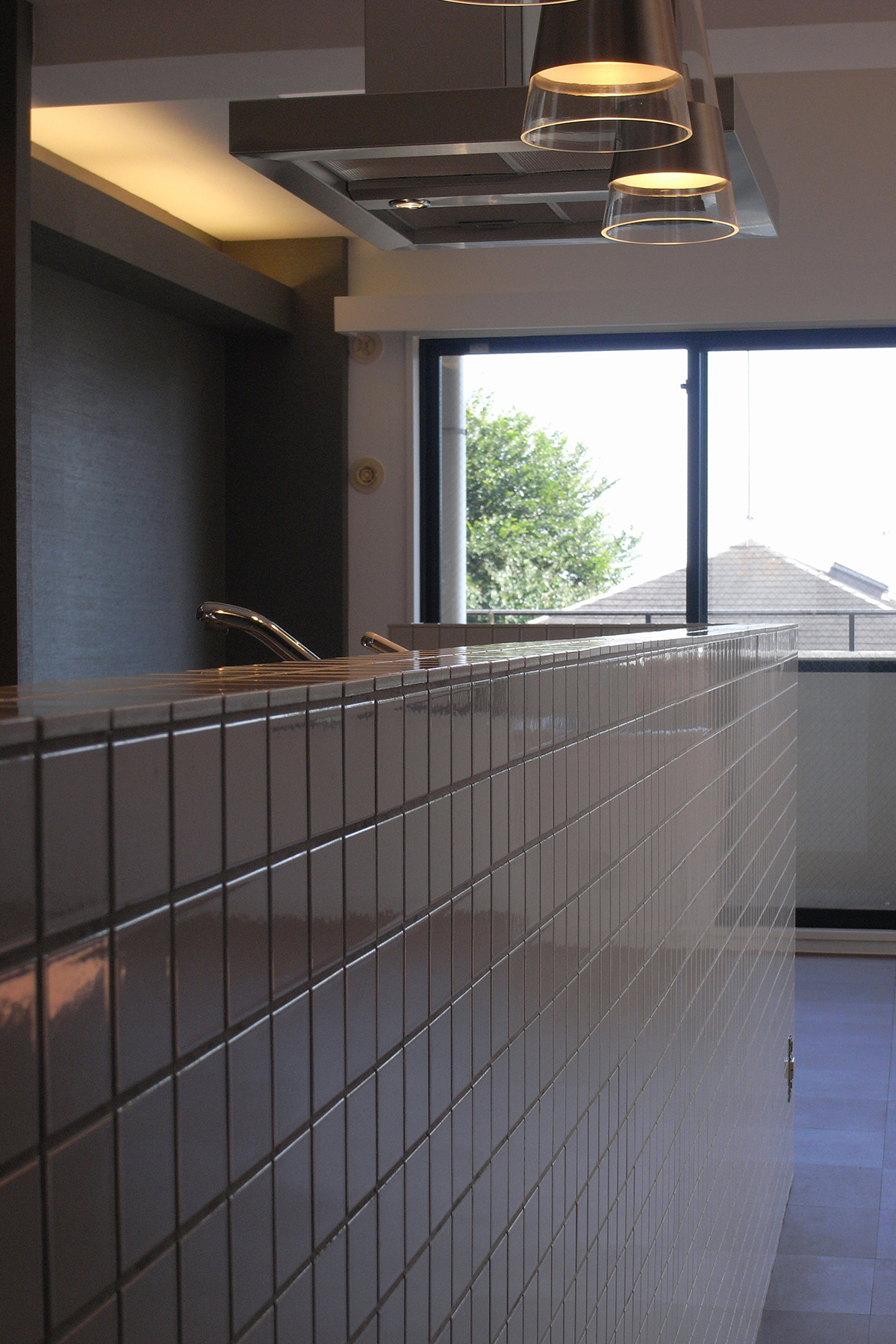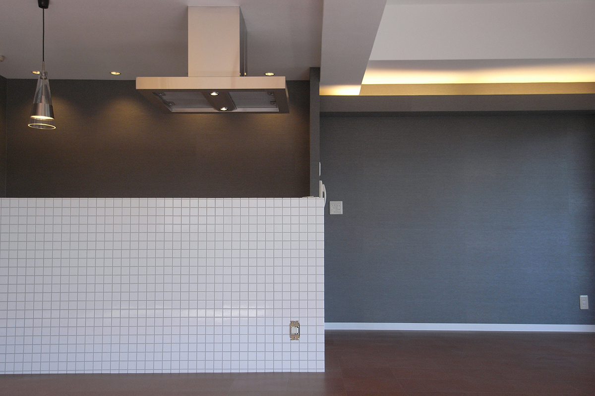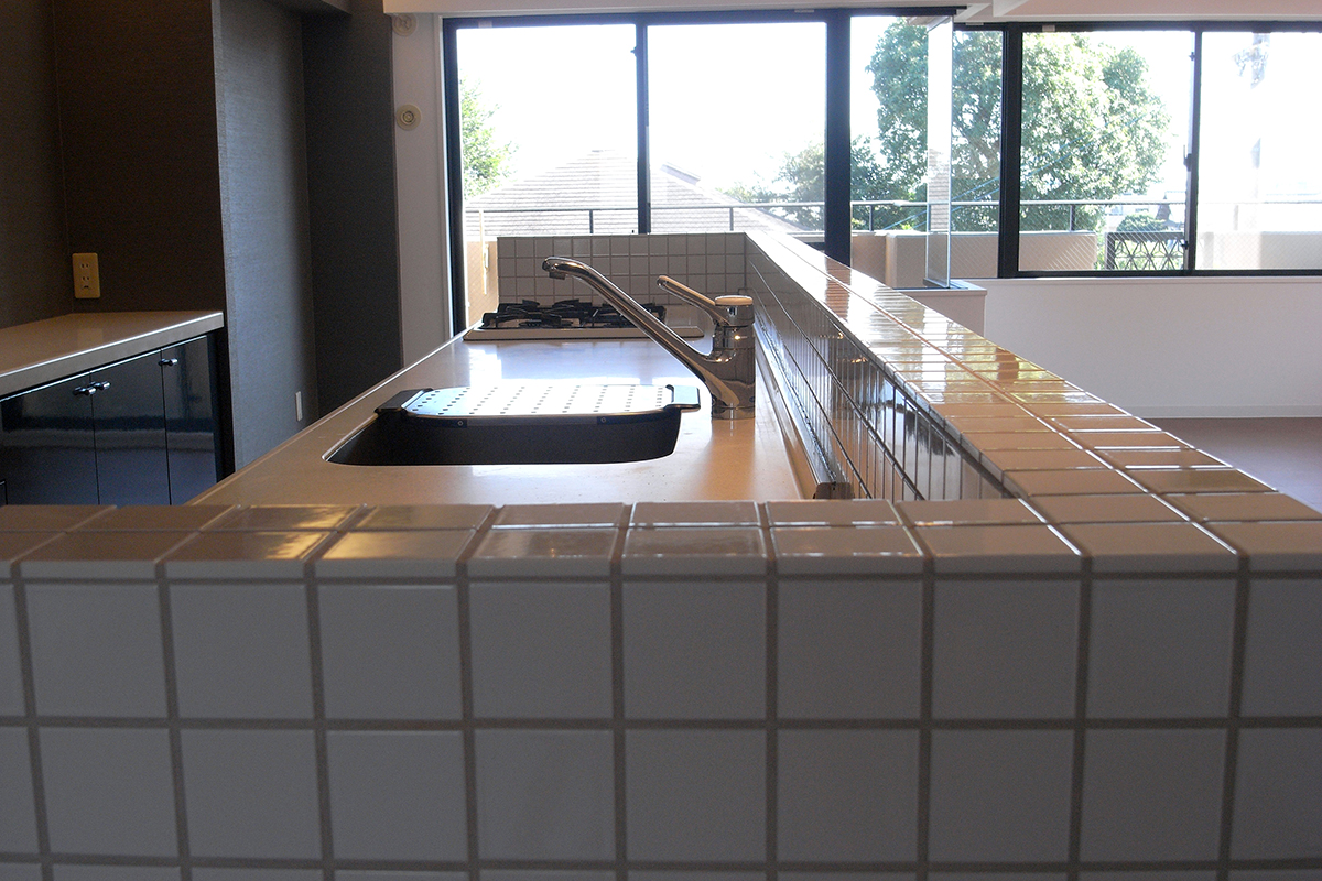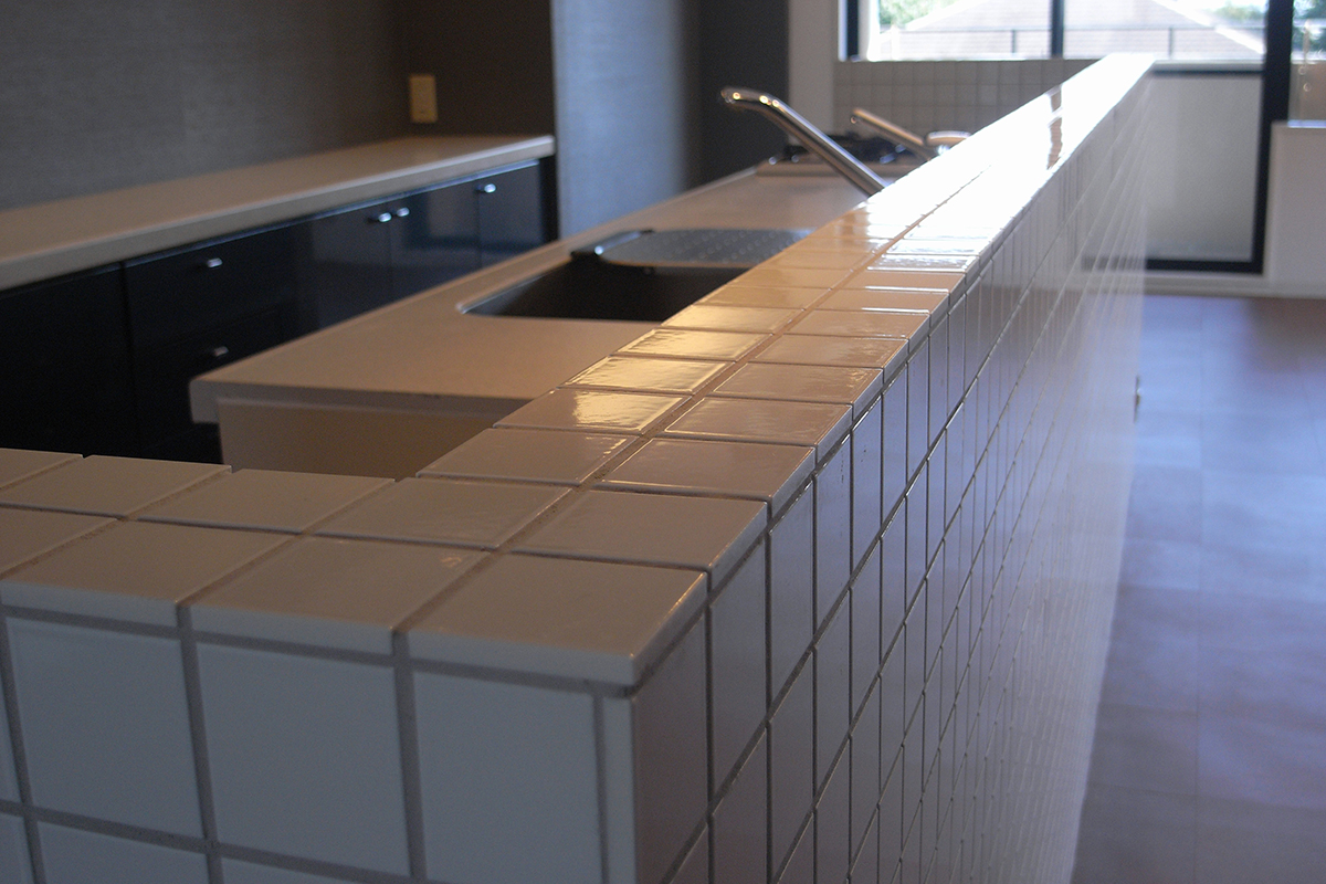 既存の壁付けキッチンを同じ位置でそのまま利用し、新たに設けた腰壁に小さなタイルを貼りアイランドキッチンに変更。キッチンのキャビネットのつまみ類は全て交換し、家全体で統一する。玄関の作り付けの下足箱本体は利用するが、扉は全て他の部屋と同じ色、素材に取り替えるなど。超スローボールと超剛速球を織り交ぜたような緩急激しい予算構成で全体を調整。