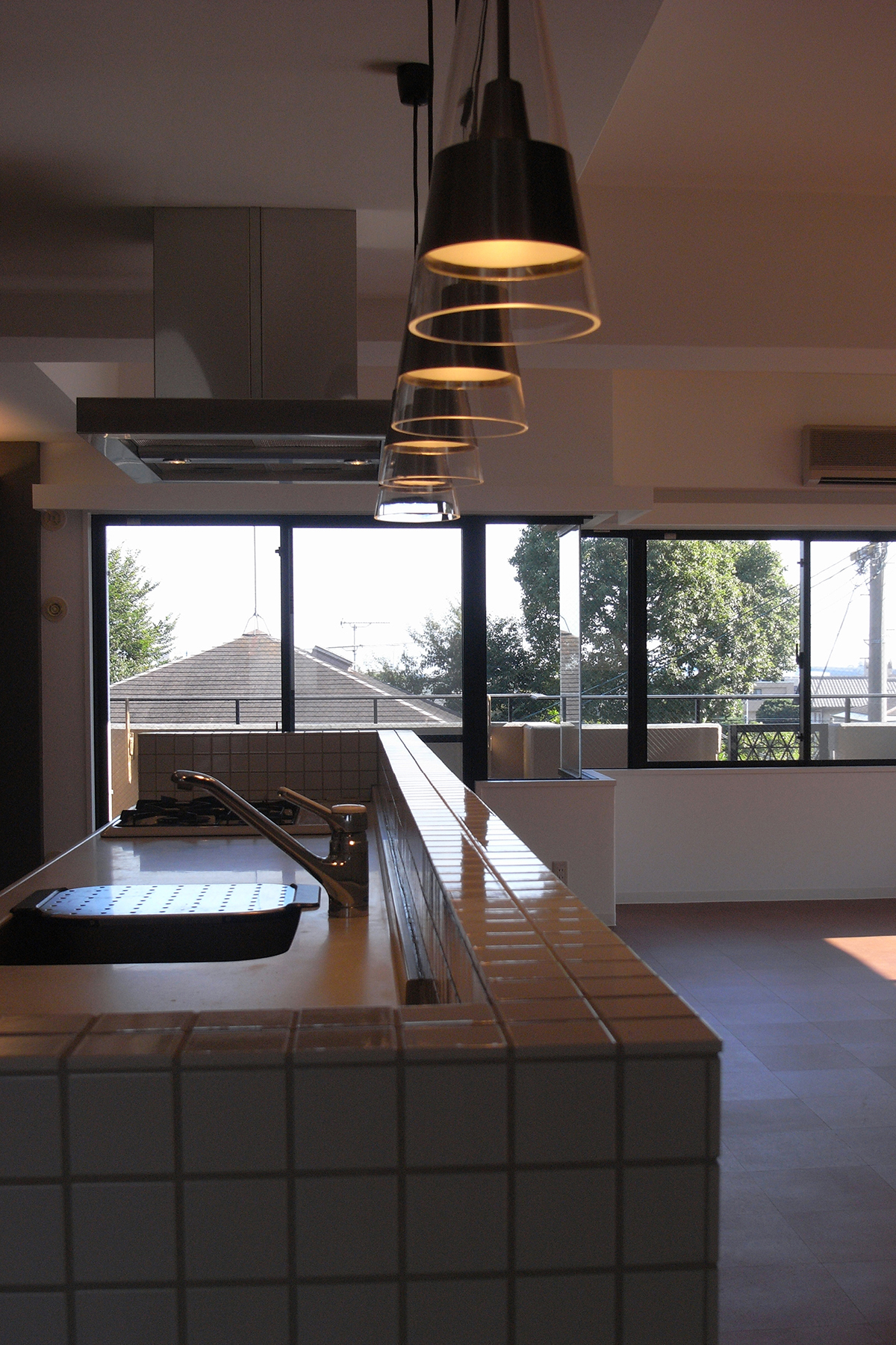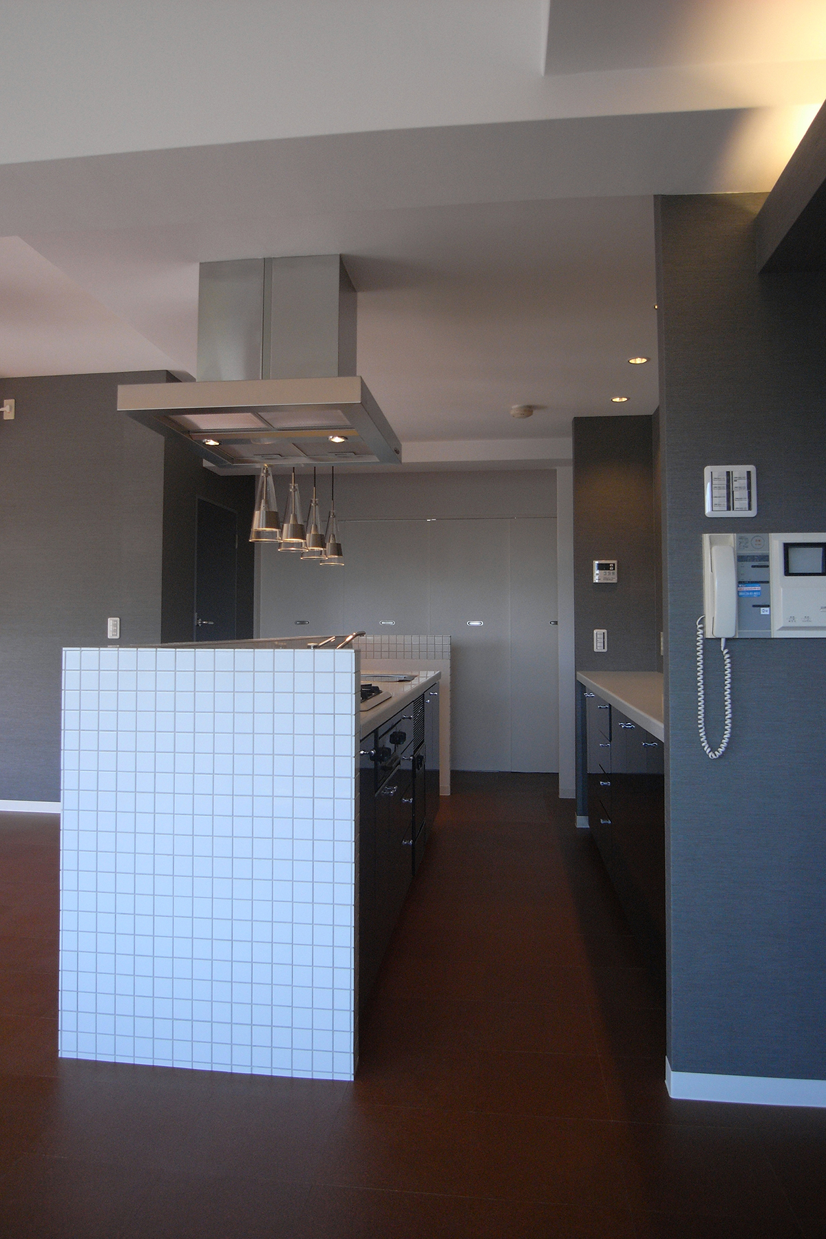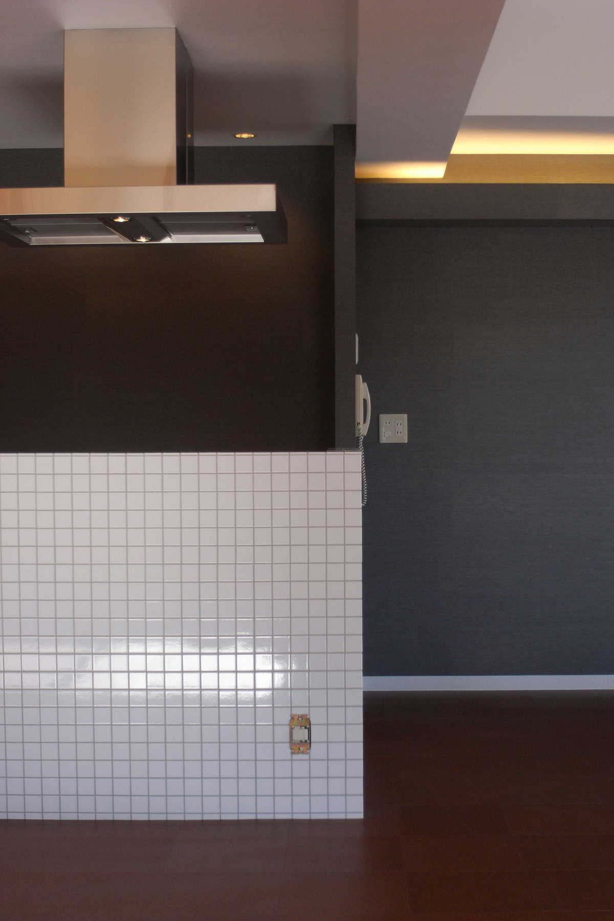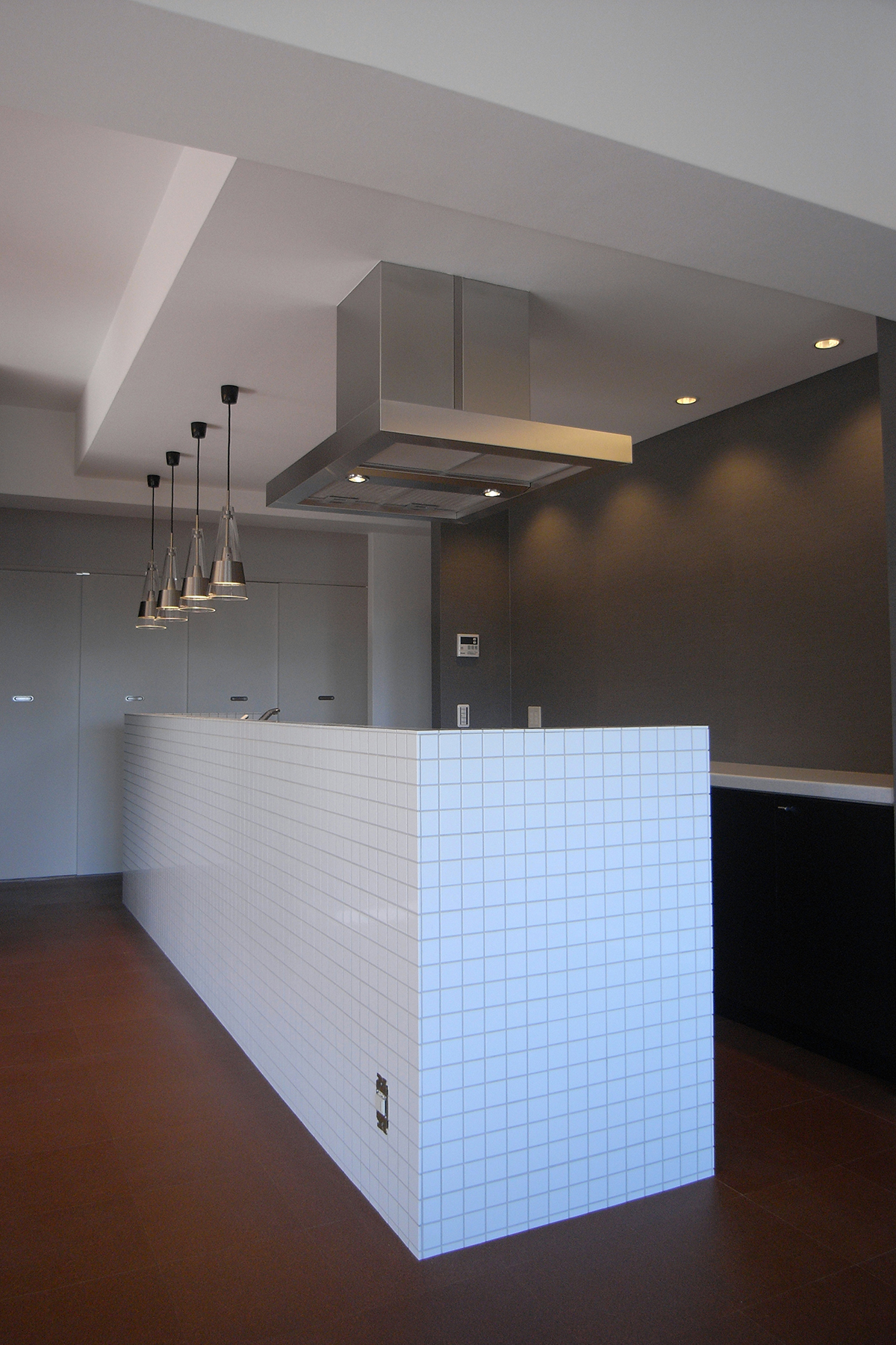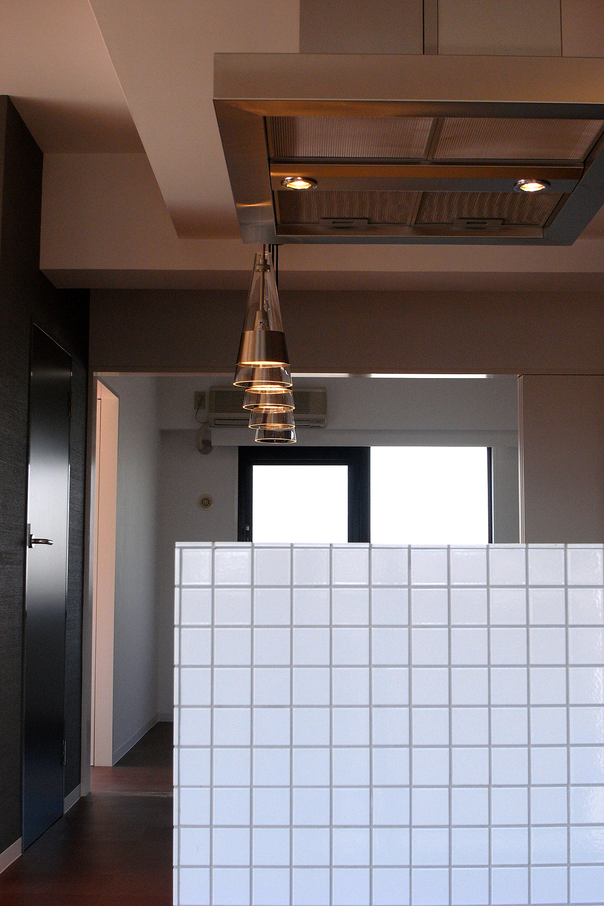 既存の壁付けキッチンを同じ位置でそのまま利用し、新たに設けた腰壁に小さなタイルを貼りアイランドキッチンに変更。キッチンのキャビネットのつまみ類は全て交換し、家全体で統一する。玄関の作り付けの下足箱本体は利用するが、扉は全て他の部屋と同じ色、素材に取り替えるなど。超スローボールと超剛速球を織り交ぜたような緩急激しい予算構成で全体を調整。